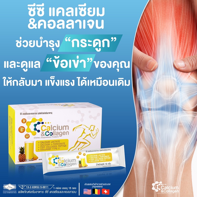 ใครควรกิน? ซีซี แคลเซียมและคอลลาเจน(CC-Plus) - ผู้ที่มีปัญหาปวดตามกระดูกและข้อ - ผู้ป่วยโรคกระดูกพรุน - ผู้ป่วยโรคข้อเสื่อม - ผู้ป่วยโรคเข่าเสื่อม - ผู้ที่ฟักฟื้นหลังการผ่าตัด - ชาย หญิงที่เริ่มเข้าสู่วัยทอง - ผู้ใหญ่อายุ30+ - ผู้ที่มีปัญหาผิวพรรณ เช่น ผิวแห้งกร้าน ริ้วรอย - ผู้ที่ออกกำลังกาย/นักกีฬา รู้หรือไหม? ทำไม..... ต้องกิน คอลลาเจน ร่างกายของมนุษย์มีคอลลาเจนประมาณ 40% โดยเป็นส่วนประกอบใน ผิวหนัง กระดูก ข้อต่อ ขน เส้นผม ผิวหนัง ทั้งพบในกระจกตา กระดูกอ่อน กระดูก หลอดเลือด ทางเดินอาหารและหมอนกระดูกสันหลัง รวมถึงเนื้อเยื่อทั้งหมดในร่างกาย กล่าวได้ว่า คอลลาเจน เป็นส่วนสำคัญที่ทำให้เซลล์เชื่อมต่อกันได้ รวมทั้งทำให้ร่างกายของเราแข็งแรงสมบูรณ์ด้วย